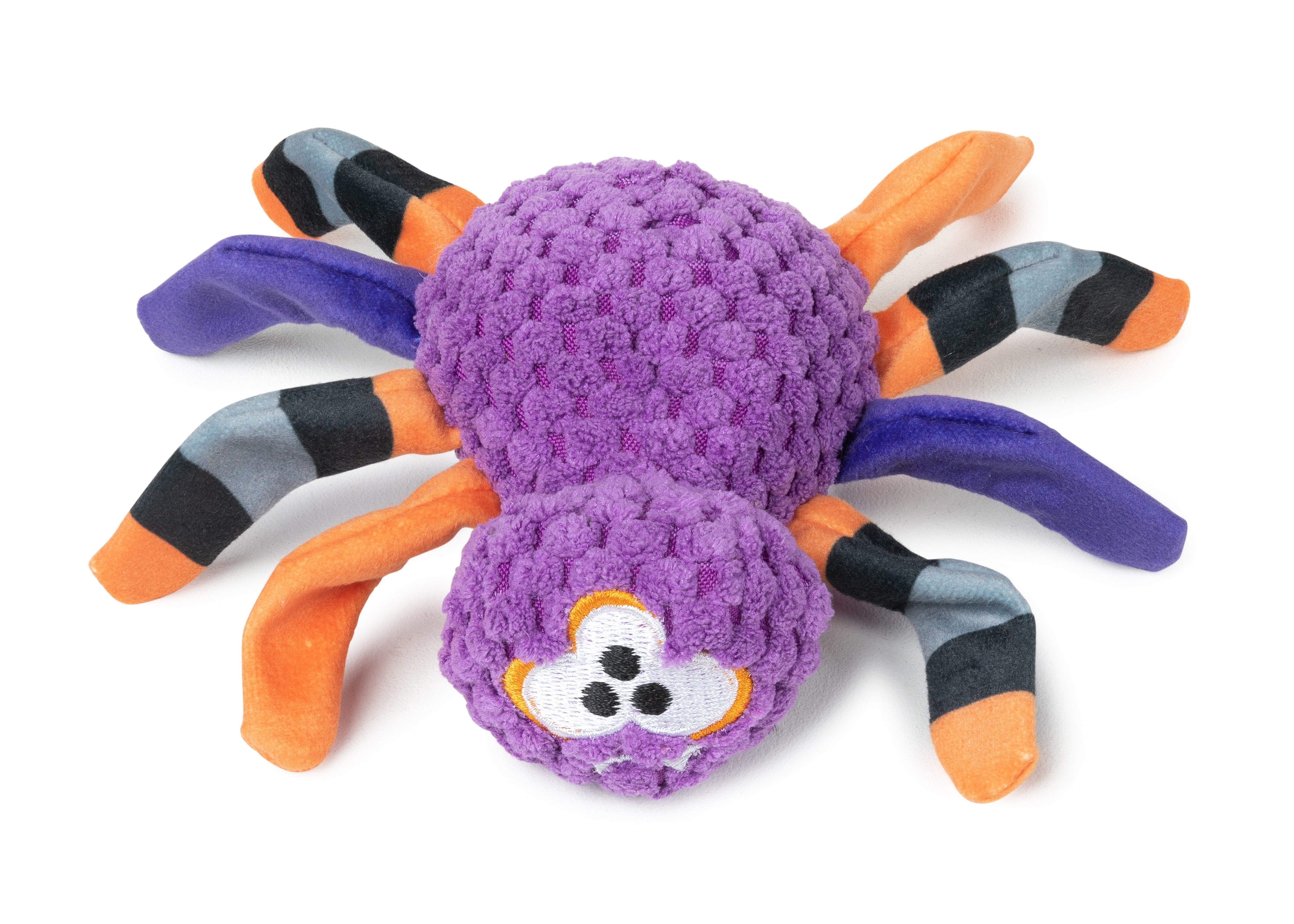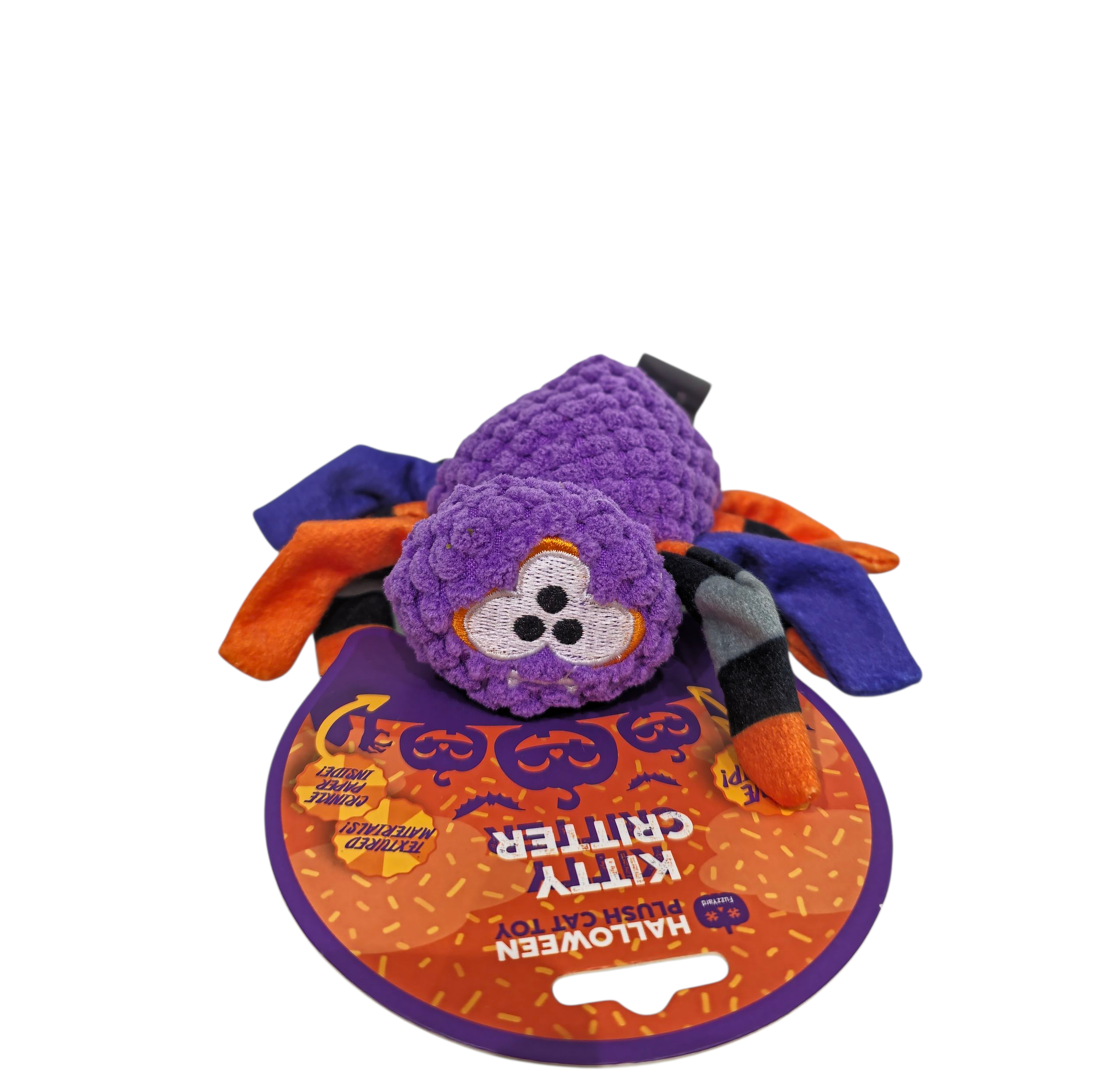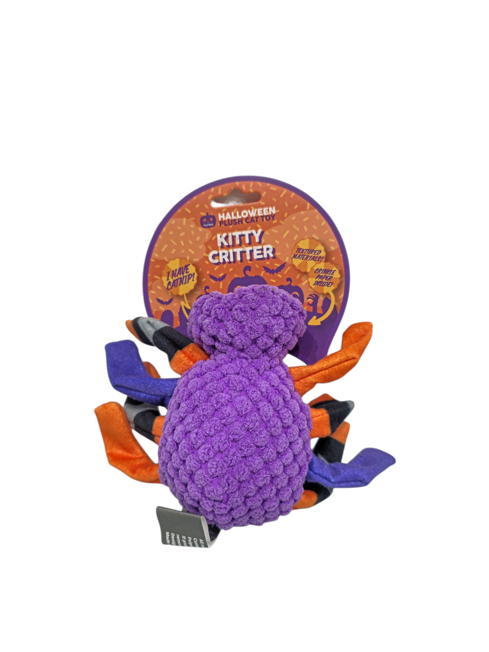 Esta araña morada de FuzzYard está lista para conquistar a tu minino con sus patitas locas y su irresistible textura.