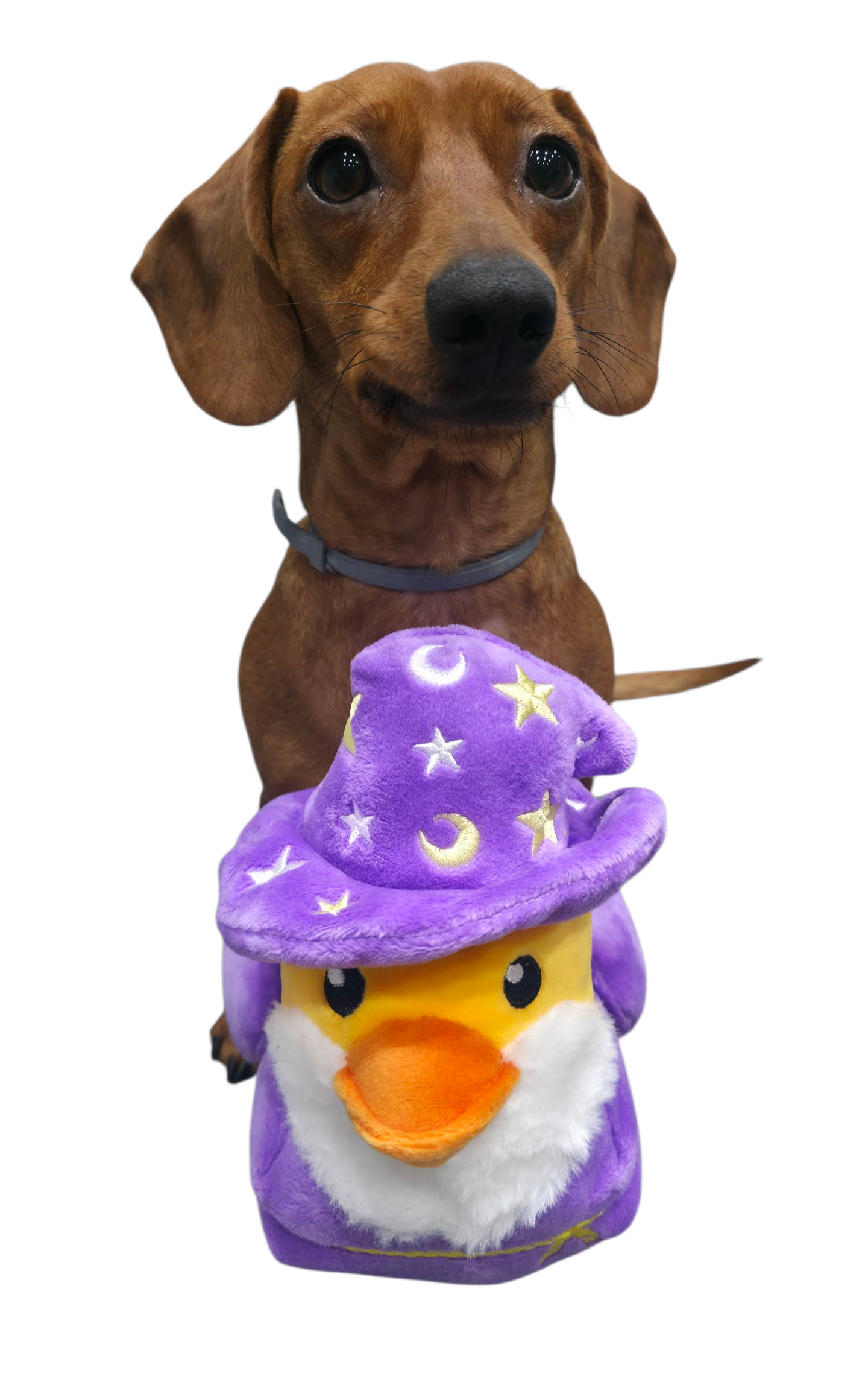 ¡La magia del juego está servida! ✨ Sirius Quack es el pato más encantador del mundo perruno. Con su túnica morada, sombrero estrellado y barba blanca, este mago está listo para lanzar hechizos de diversión infinita. Suave, mullido y con un diseño único, será el nuevo favorito de tu peludo.